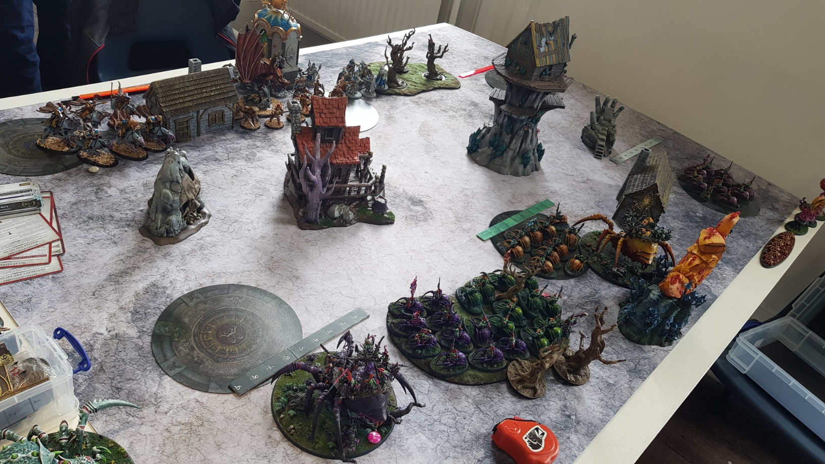 Just my luck, I matched straight into the sweatiest list at the tournament: Cities of Sigmar (Veteran Canoneers) with 3 Greatcannon, 3 Command Corps and Zenestra – but its owner, Craig, realising it was my first ever tournament game, was very sporting and played in such a way as to make it a less one-sided battle than it probably should have been by offering advice and choosing not to put the boot in quite as much as he could have done. As a result, I had a pretty good time even as his cannons point-and-clicked my army away, and we finished 59-61 to him. Thanks Craig!